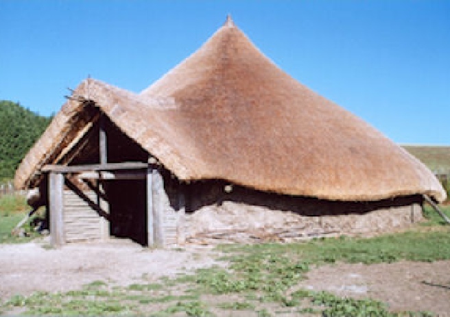 Grain storage in underground pits was the theme of Peter's thesis and the work done on the Little Butser site was shown by example, on the left above. Here the pit is shown with a roof protection. To the right is one embodiment of a haystack based around a single post hole. For more on Grain Storage click here.