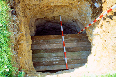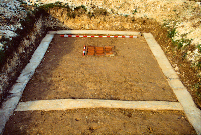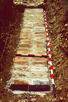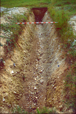 A variety of constructs and materials were included. Linear features of different depths, widths, orientations and both with and without wall foundations were built. The wall foundations are of brick or flint. There is a "floor" level, various pits and voids, and two ditch systems with variations in construction details along their lengths. The site was completed during 2003.