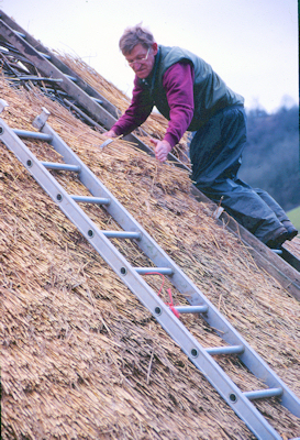 Peter Reynolds chose to construct the initial wooden phase of the house. He had previously built a construct of this house at the National Museum of Wales at St Fagans in 1993 but wanted to explore a different method of roof construction at Bascomb with a basketwork cone instead of an upper ring to brace the rafters. The house was partially complete when he died in 2001 and completed in 2002.