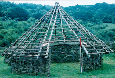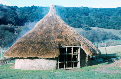 These two houses constructed at BAFDA in 1978 are based upon excavations carried out at an lron Age Hillfort or town in North Wales. The construction technique was totally different to that of the Pimperne House. The walls were built of very thin stakes averaging no more than eight centimetres in diameter and then wattled and daubed. The roof structure similarly was of very light materials. Perhaps such constructions indicate an overuse of timber resources and a need to use significantly less strong timbers. The smaller of the two houses was used for overwintering the cattle and the collection of animal manure for subsequent spreading on the fields. The floor area was tested each year for build up of phosphate concentration since this is one way of isolating function of such buildings (but no records survive). The larger house, in fact the largest so far found of this type of construction, was used as a museum for the smelting and melting a