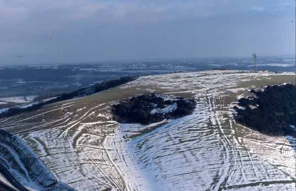 The two slides given here were taken just when they were most dramatically brought out by a snow fall. They show just how fully the slopes of Butser Hill were farmed .... intensively might well be a fair description. This was part of the reasoning used by Reynolds to argue that this region was highly populous. The final point was that the original Research Site on Little Butser showed evidence of use, even though on an inhospitable north-