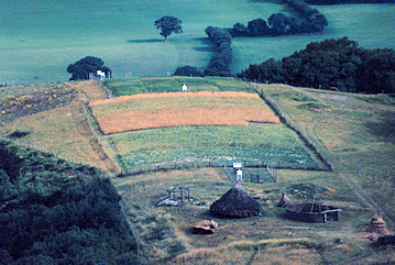 Once up and running, the site progressively evolved, with both house construction and cereal growing becoming routine. By 1974, after two years, the site was opened to the public for a couple of days in August. It would not have looked as complete as in the view below but it was on its way. The diagram above was prepared for this Open Day. The areas faintly marked 1 are the animal compounds. Area 5 is where the houses were and Area 7 represents the cereal fields, all more clearly seen in the view below.