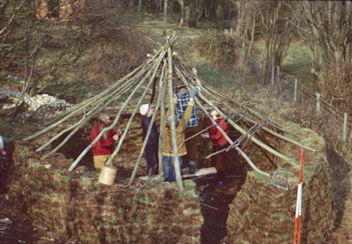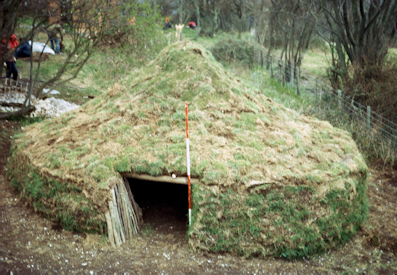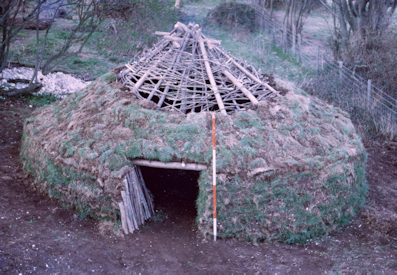 The house, some 6m in diameter, was made with turf walls just under a metre thick and a metre high. A central forked post was set in position and supported the major rafters. A rectilinear ring beam, exactly similar to the one in the Maiden Castle house, supported the supplementary rafters. All the rafter ends were simply laid on top of the turf wall. Hazel rods interwoven between the rafters formed the support for the turf roof. The pitch of this roof, because it was made of turf, was low at approximately 30°.